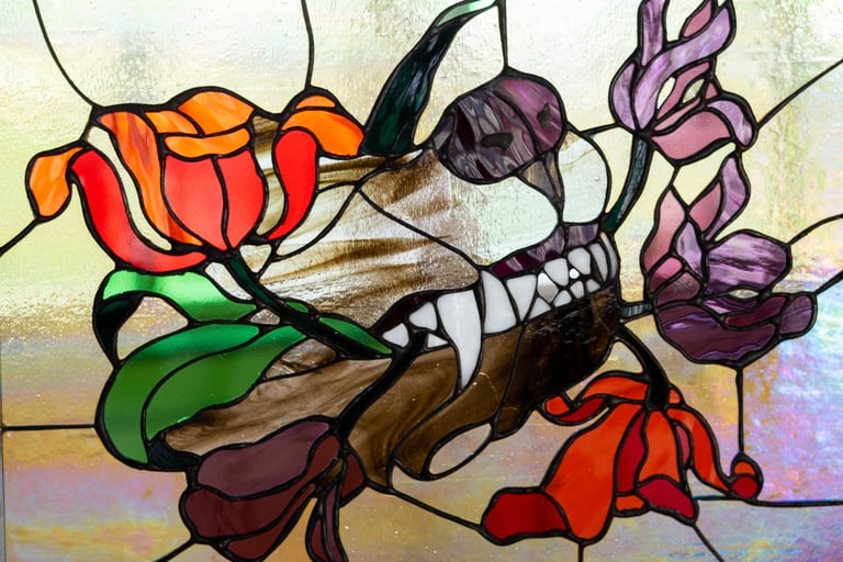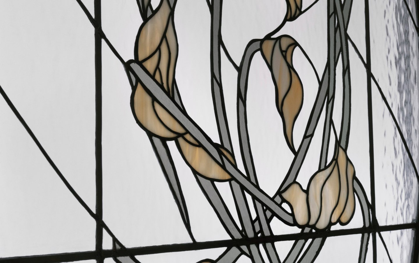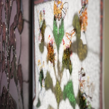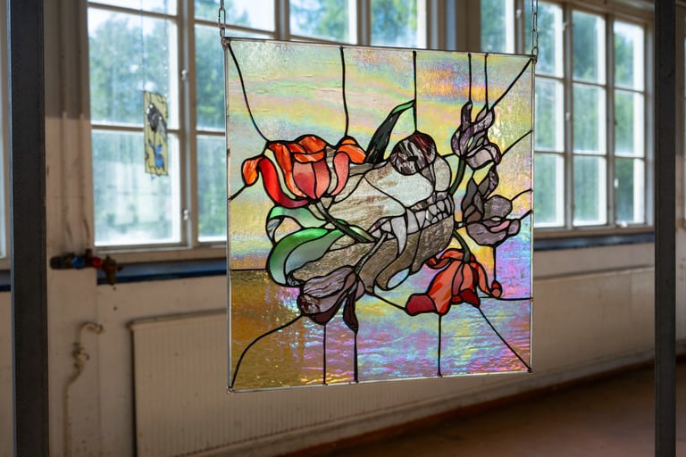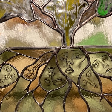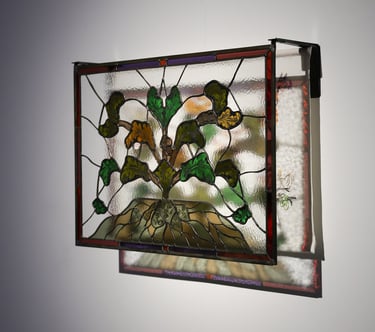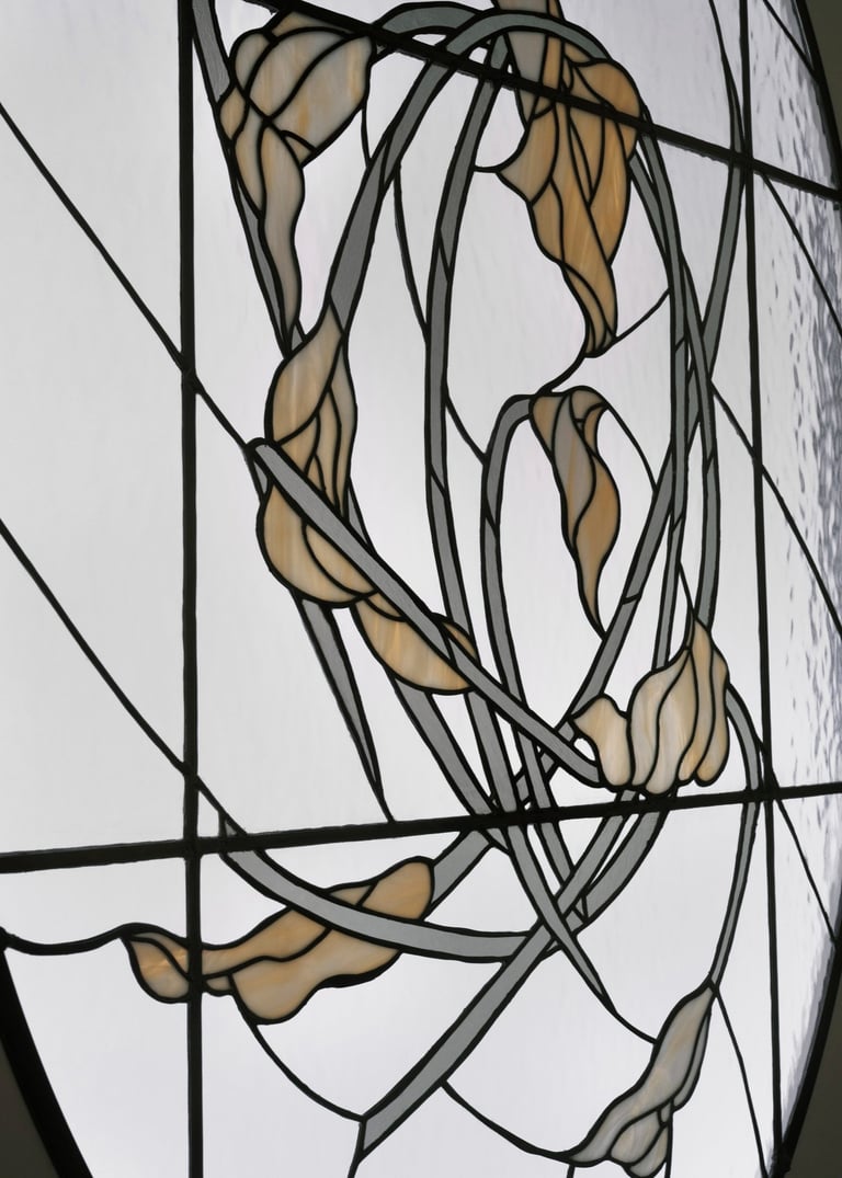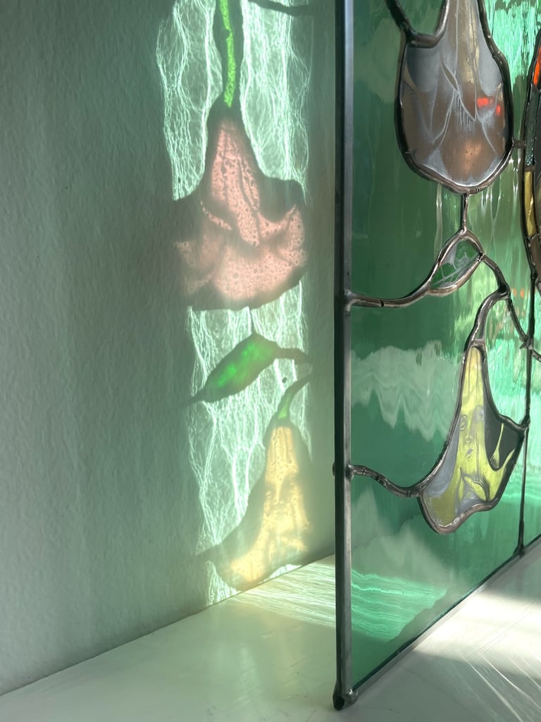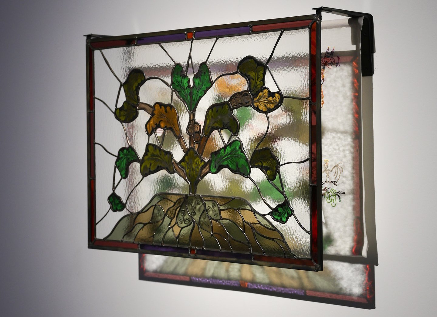 Tiffany stained-glass, lead came, zinc, and embroidery thread on linen, 2025