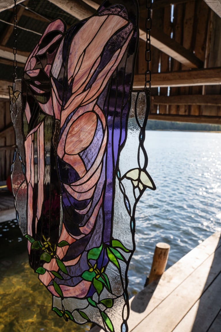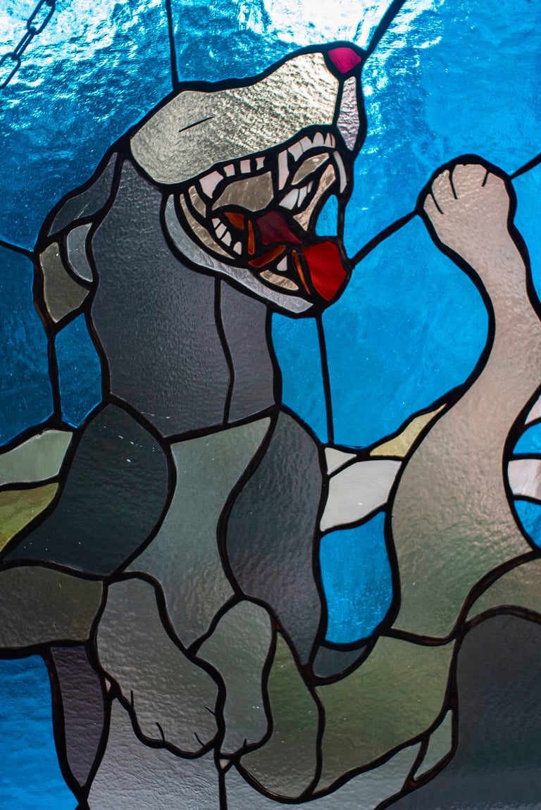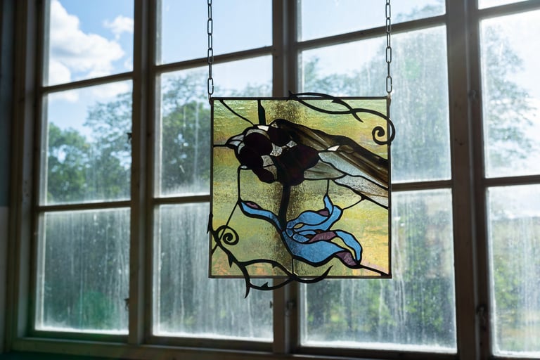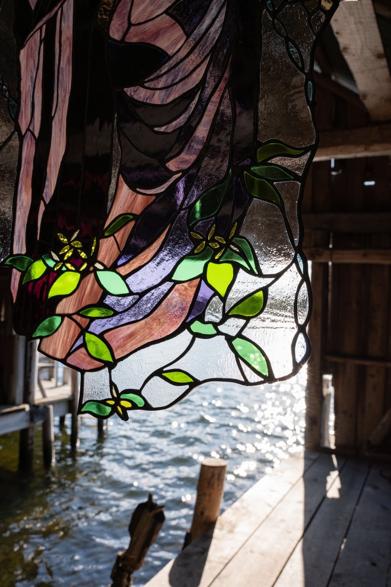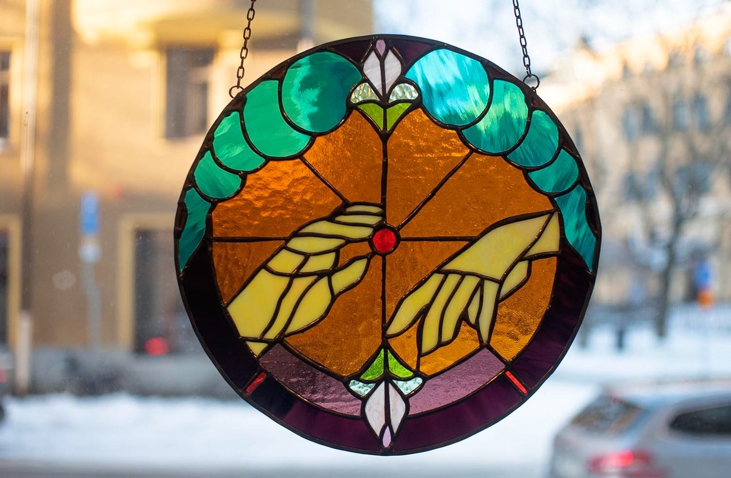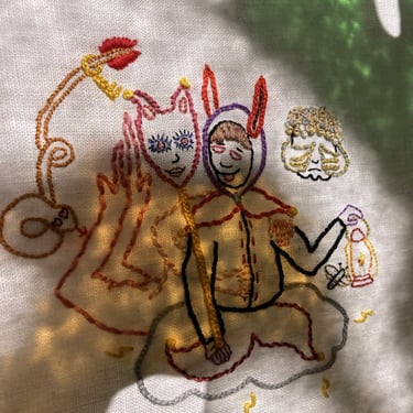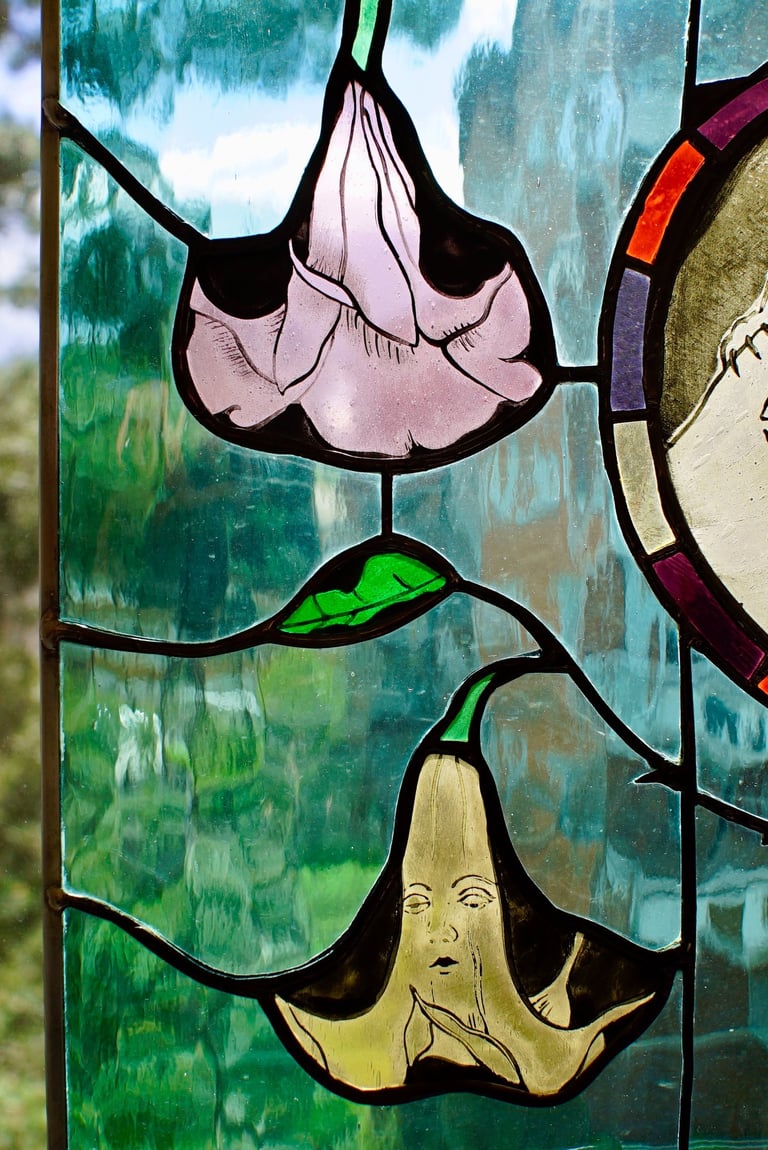 Tiffany stained-glass, lead came, zinc, and embroidery thread on linen, 2025