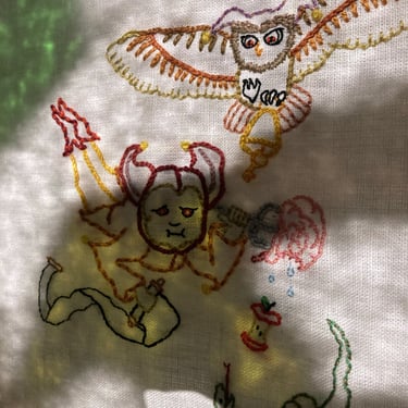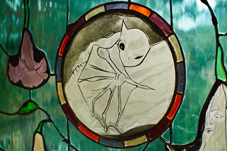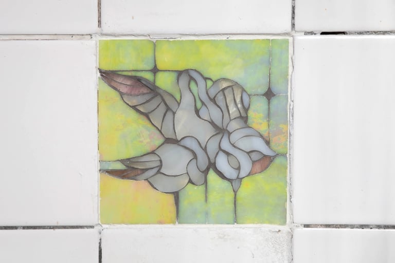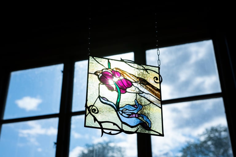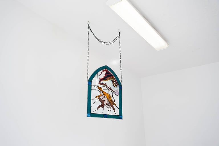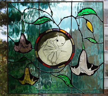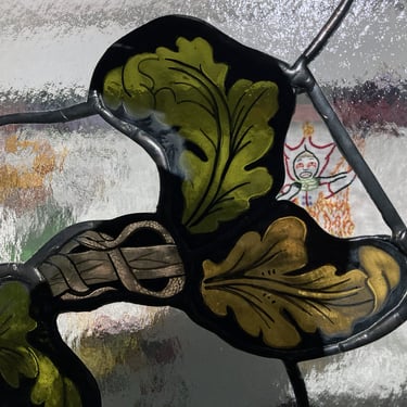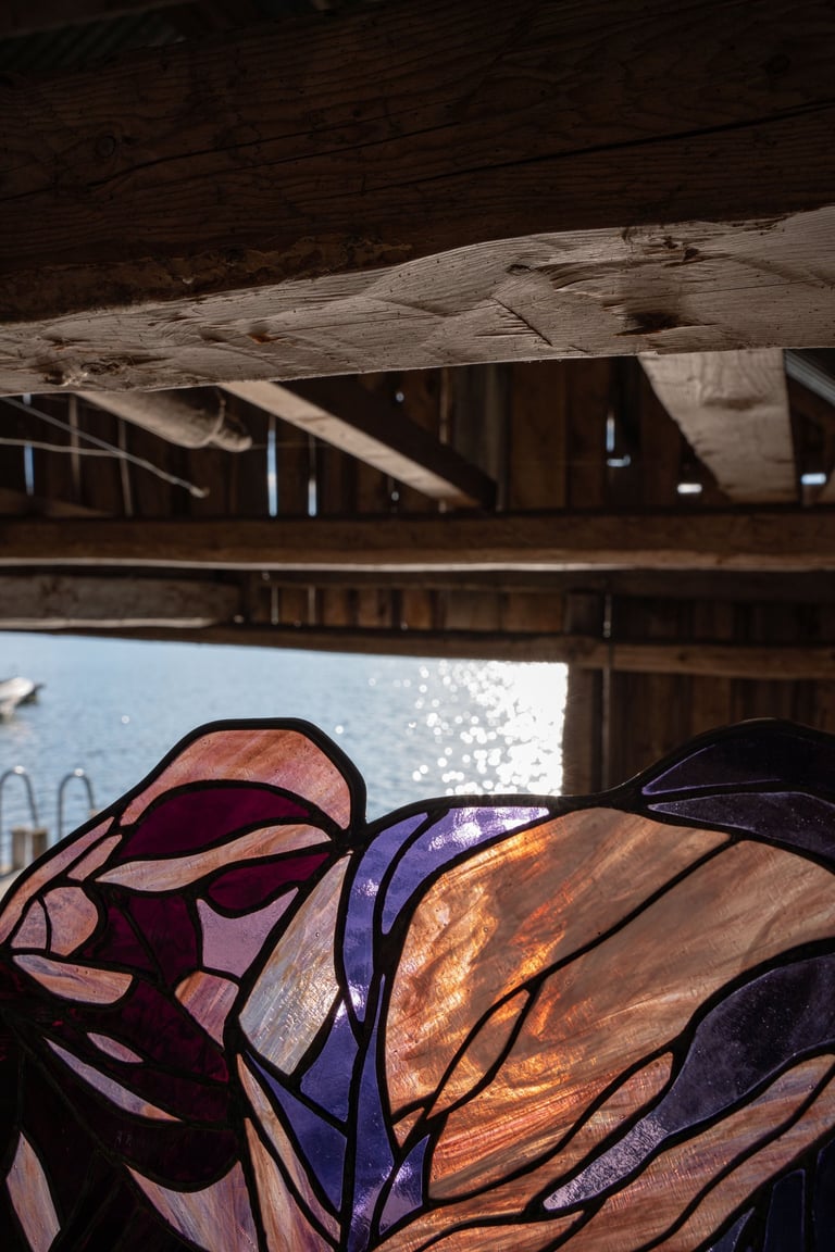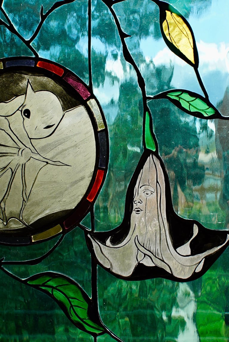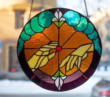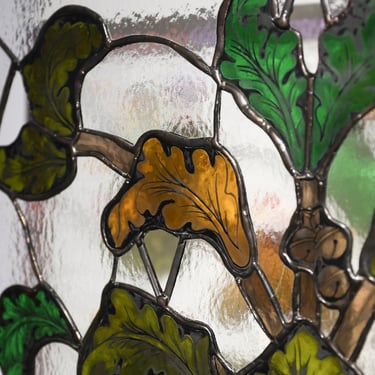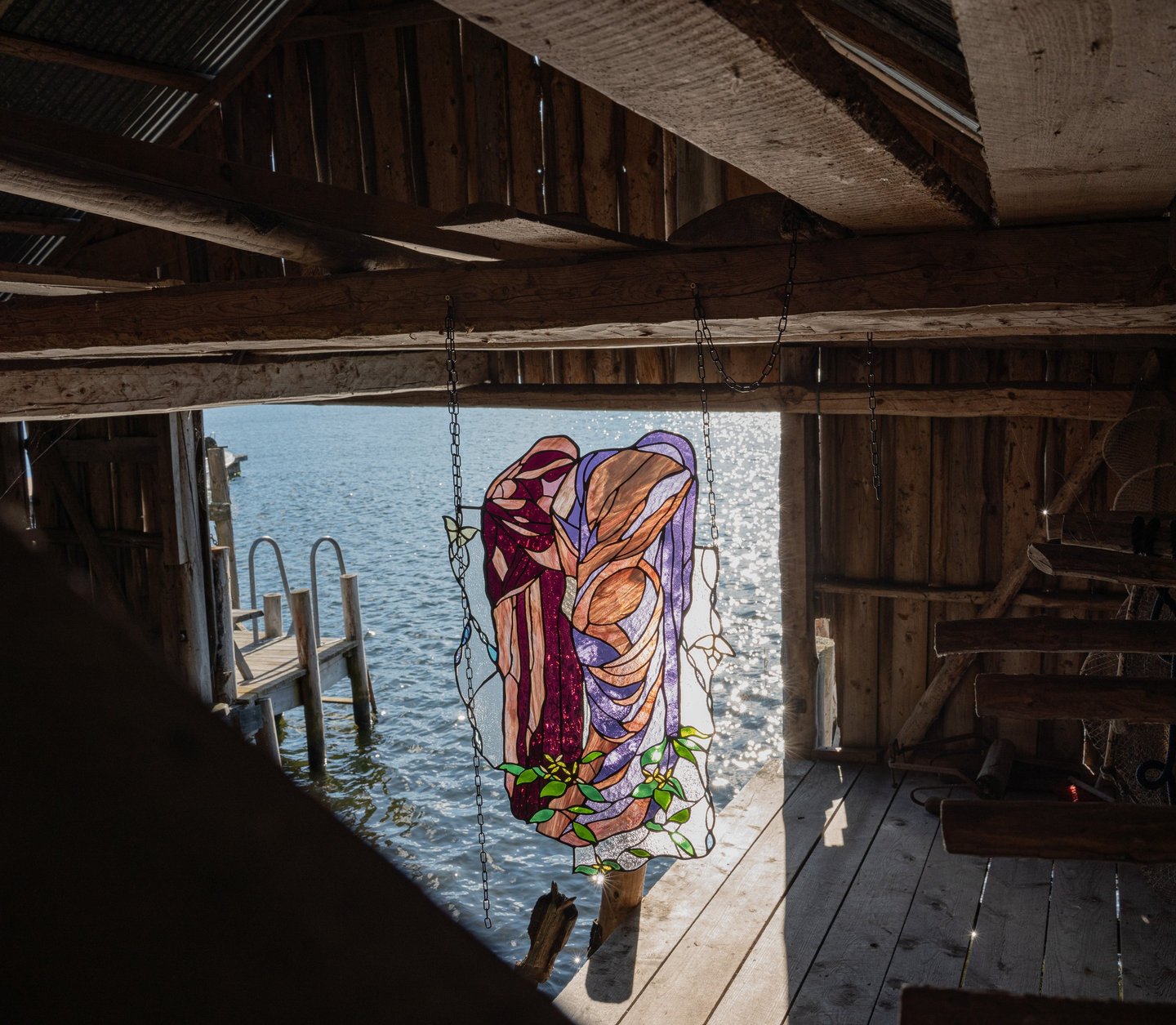 Tiffany stained-glass, lead came, zinc, and embroidery thread on linen, 2025